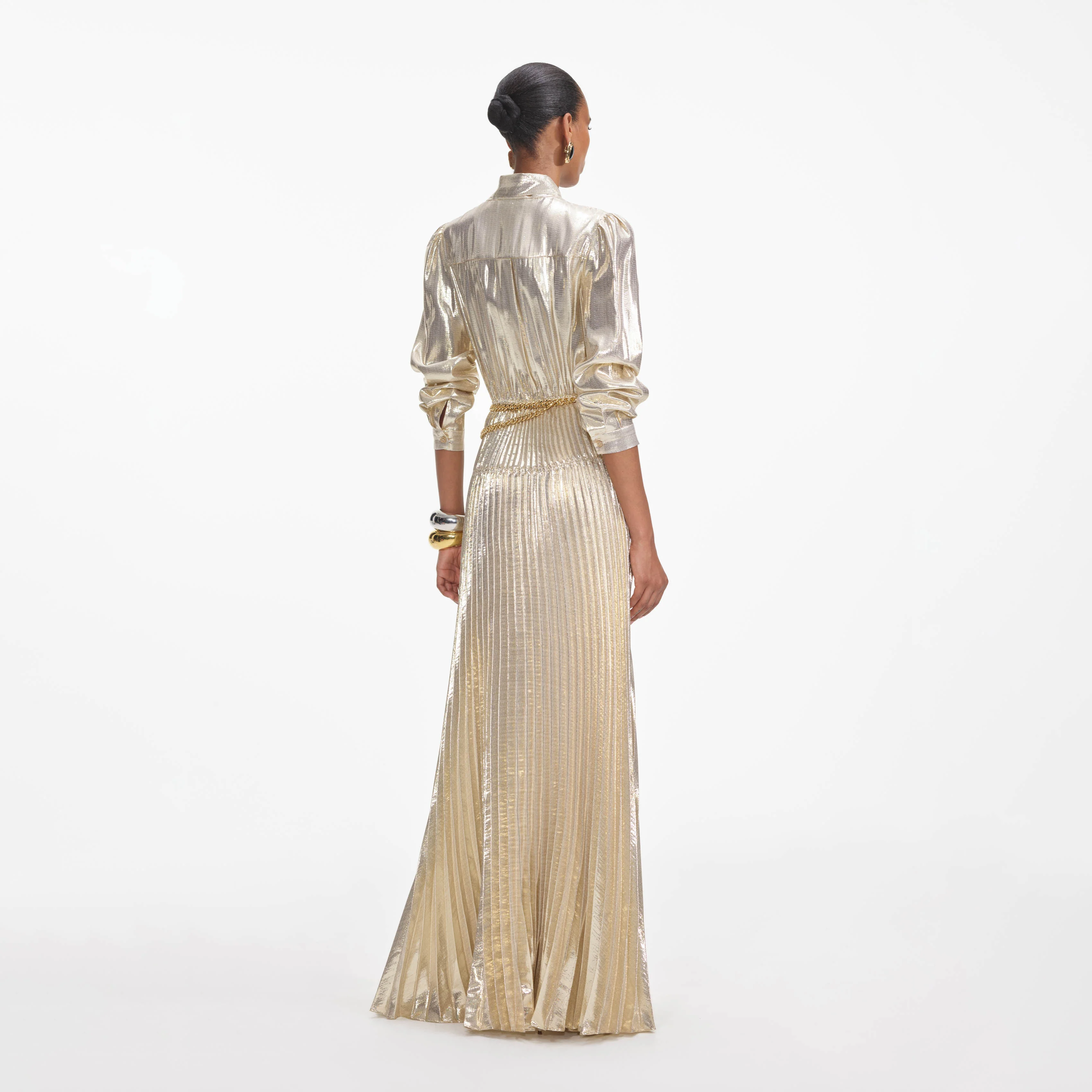 Go for gold in this metallic maxi dress, which offsets its high-octane feel with a cinched, belted silhouette and retro-glamorous pussy bow. Add our tonal accessories for extra style points.