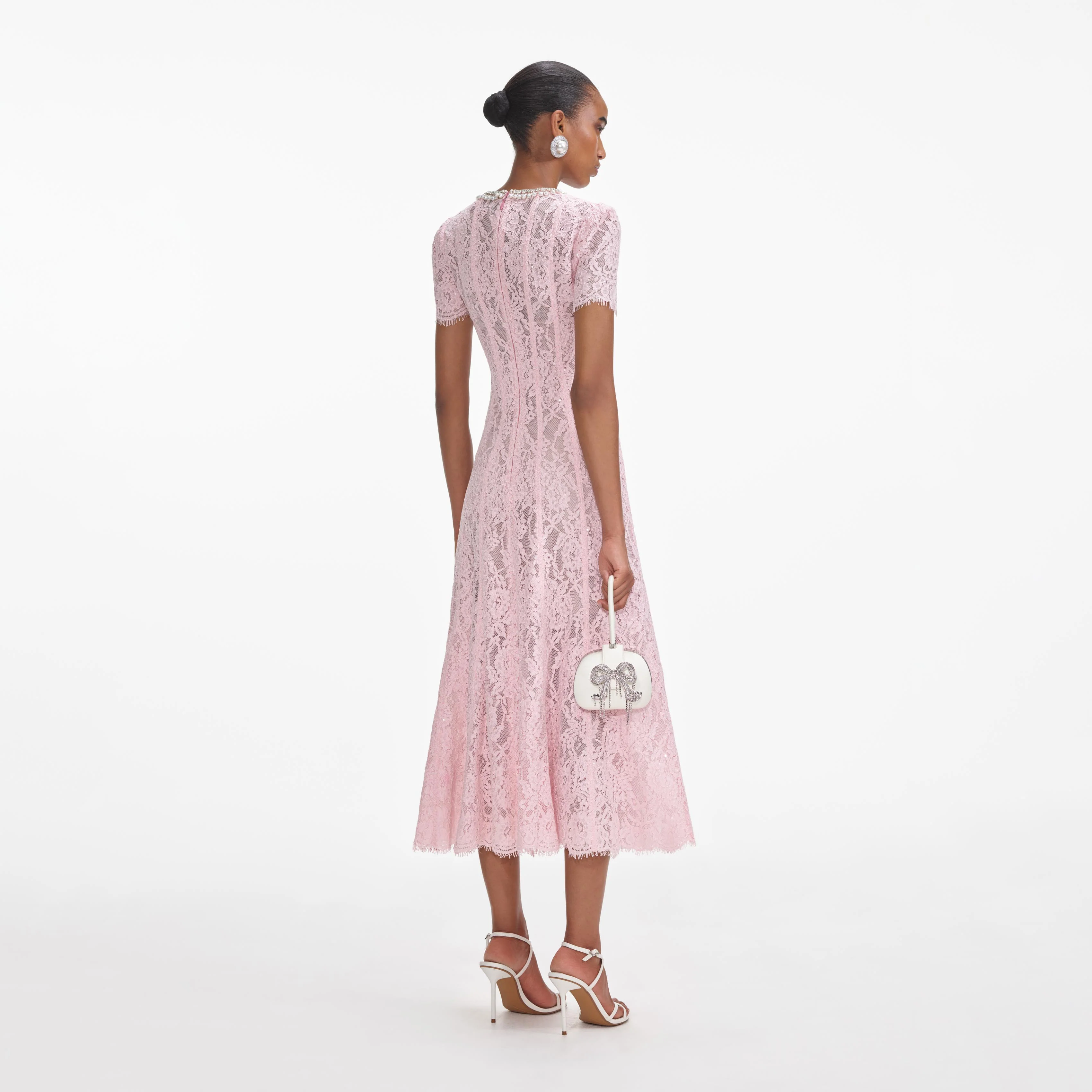 A romantic vision in baby pink lace, this dress marries our signature fabric with an artful flared silhouette and embellished trims. Pair it with our statement earrings for a night at the ballet.