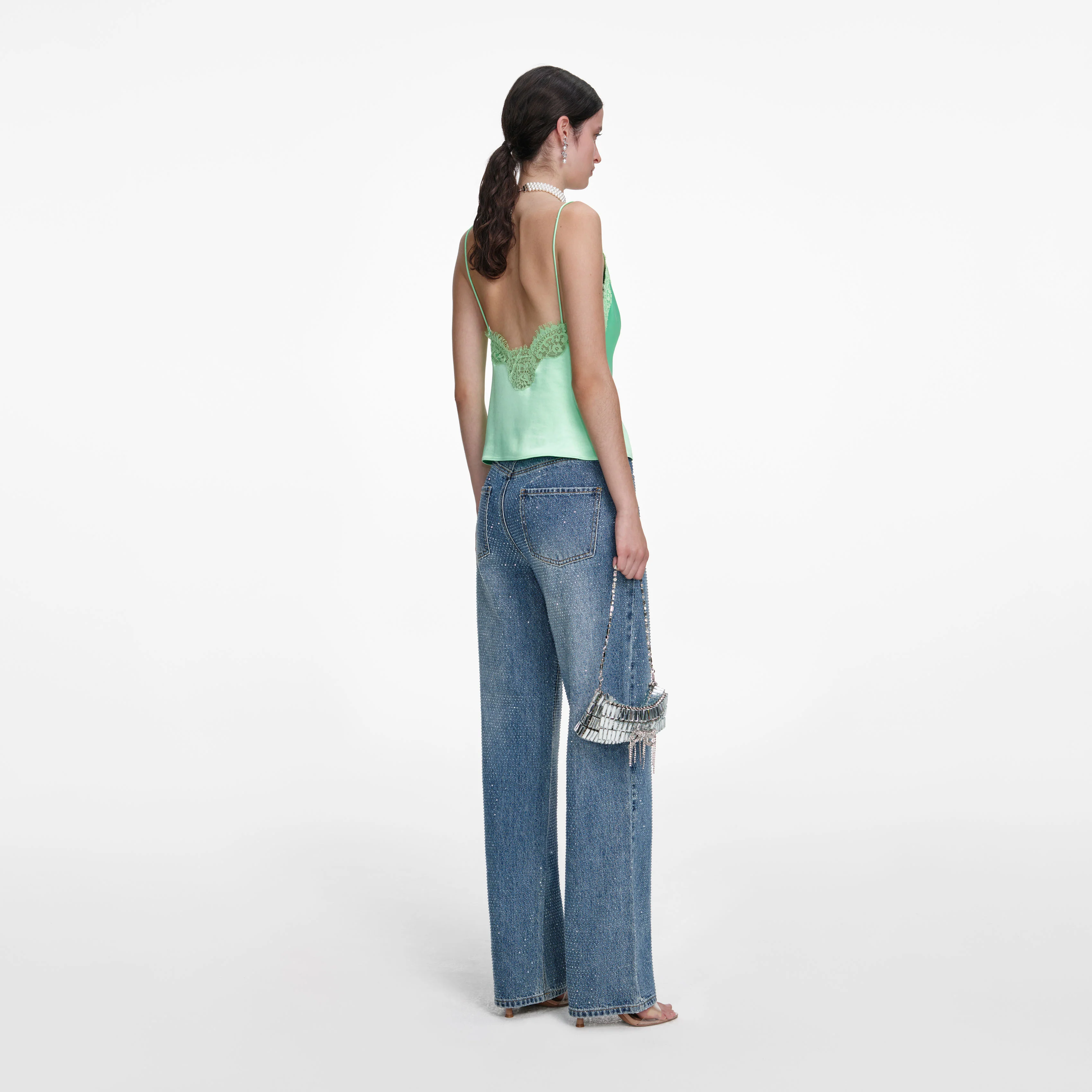 Zesty green adds a scintillating pop of colour to this green satin top. Peekaboo lace panels and a low plunging back pay tribute to boudoir chic – style with baggy jeans and heels for a hot date.