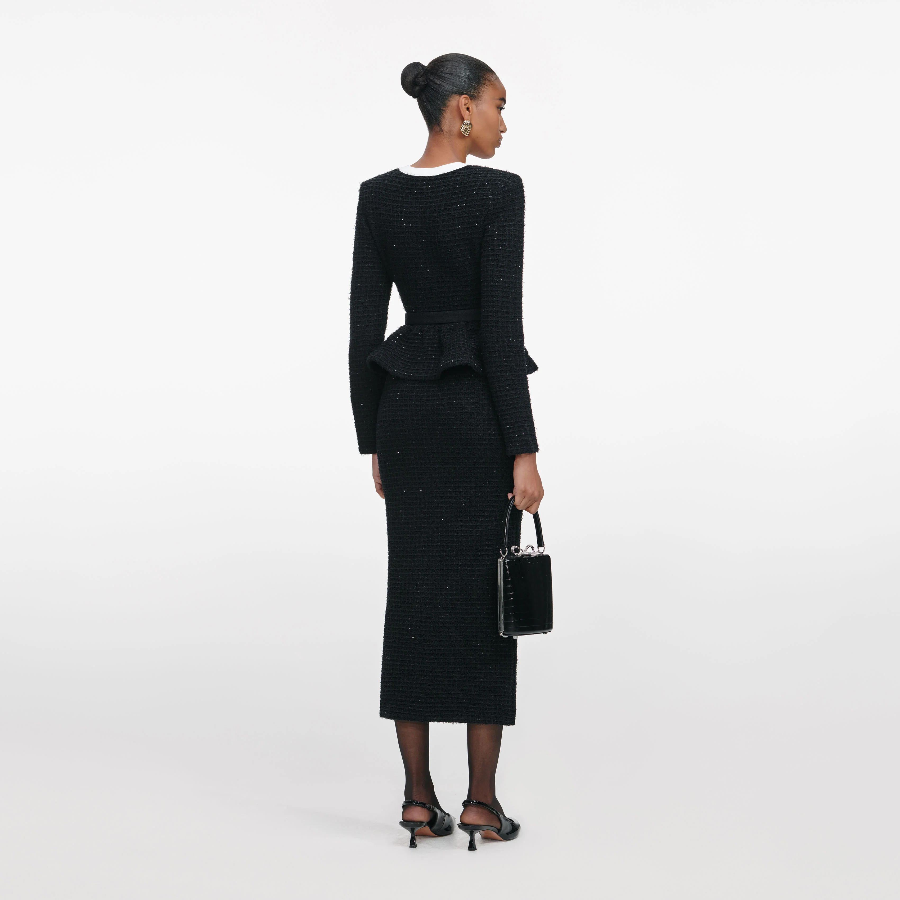 Floral sequin motifs and striking contrast trims bring ladylike polish to this black textured knit dress. A belted peplum waist flatters the form – add our statement jewellery for date night.