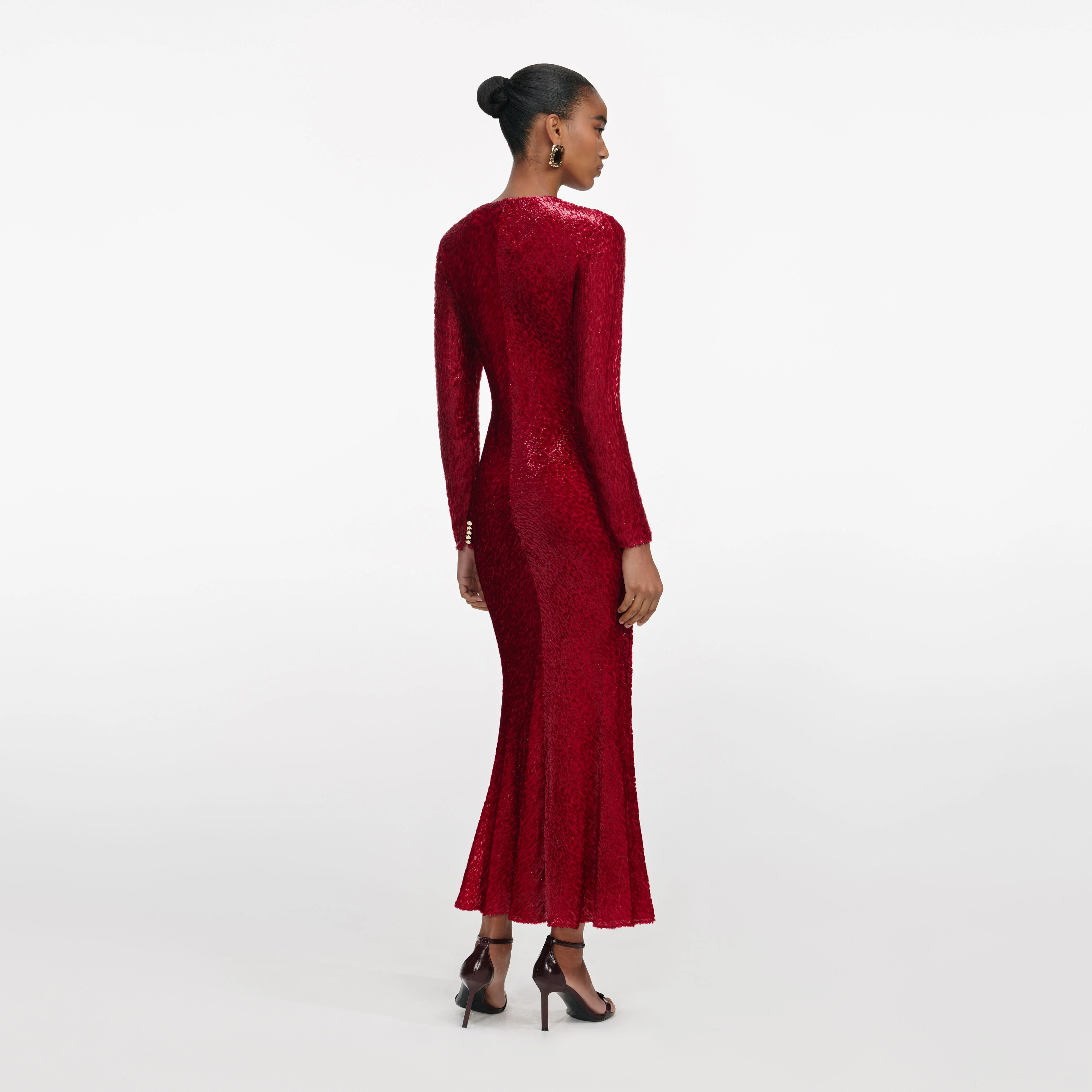 Work all angles in this red midi dress, cut from metallic fil coupé for irresistible shine. A keyhole detail adds extra intrigue – show off its flared hem with sky-high heels at the next event.