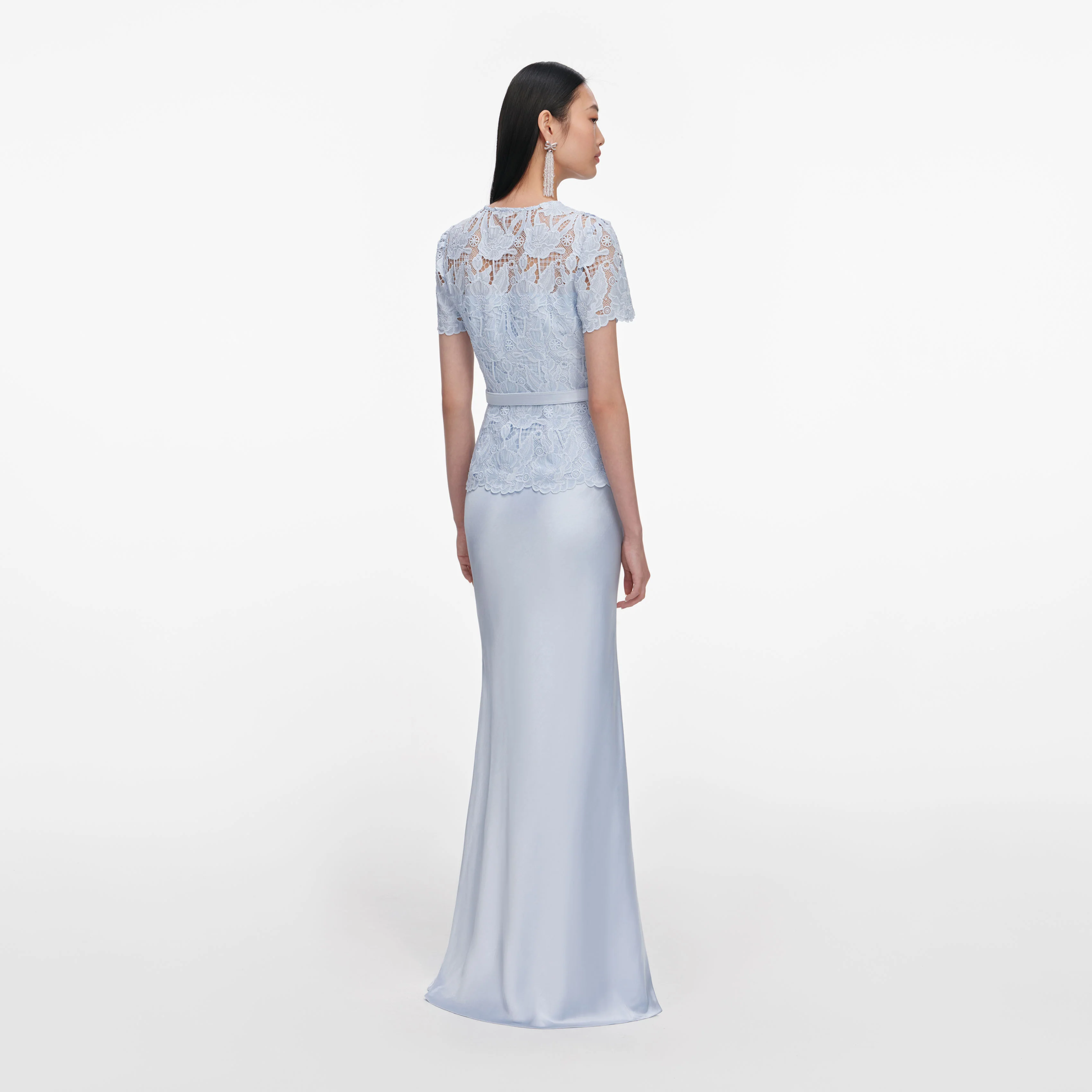A marriage of perfection: elegant blue lace meets high-shine satin in this timeless maxi dress. Its belted waist cinches in the form whilst diamanté trims and buttons add irresistible sparkle.